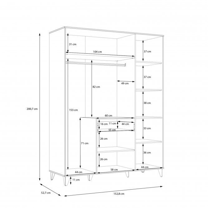 - Szafa o wymiarach 152,8 cm szerokości, 200,7 cm wysokości oraz 53,7 cm głębokości sprawdzi się w srednim metrażu