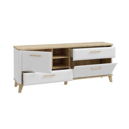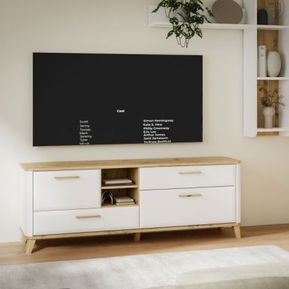 Szafka RTV o szerokości 170 cm z kolekcji WARDIOL oferuje sporo miejsca na sprzęt multimedialny oraz telewizor o przekątnej ekranu do 75 cali. 2 duże szafki oraz 2 szuflady pomieszczą wszelkie niezbędne akcesoria kinomaniaka, a 2 otwarte wnęki możesz wykorzystać na wyeksponowanie pamiątek lub dekoracji. Szafka RTV WARDIOL wykonana jest w białym kolorze z subtelnymi wstawkami dekoru Dąb Artisan, dzięki czemu doskonale komponuje się z nowoczesnymi i skandynawskimi aranżacjami wnętrz. Drewniane uchwyty, wysokie nóżki oraz zaokrąglone krawędzie podkreślają naturalny urok i styl mebla.
