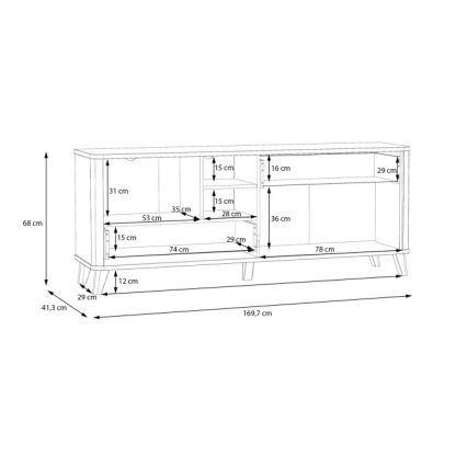 • Wymiary szafki RTV: szerokość: 169,7 cm x wysokość: 68 cm x głębokość: 41,3 cm