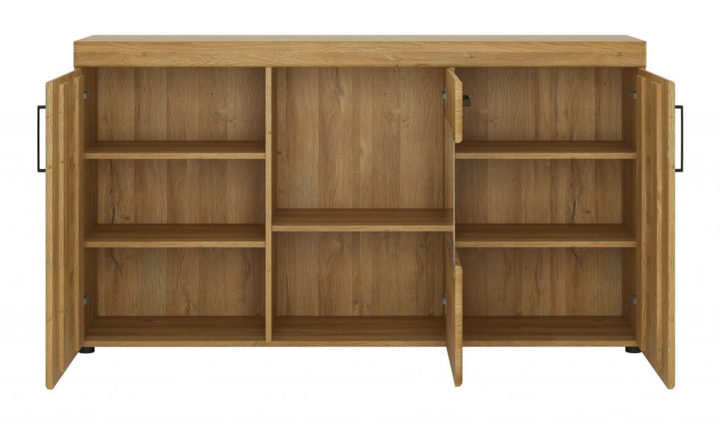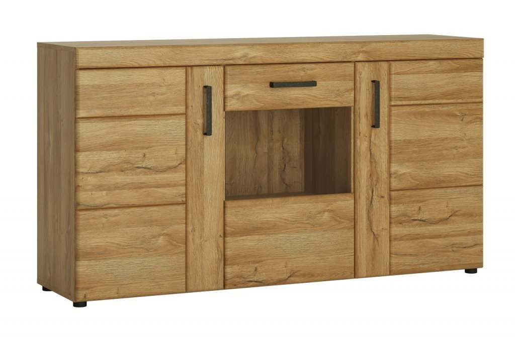 - Dzięki pojemnym szafkom zachowasz w domu porządek, a w przeszklonej, środkowej części mebla wyeksponujesz np. elegancką zastawę, kieliszki lub pamiątki rodzinne.